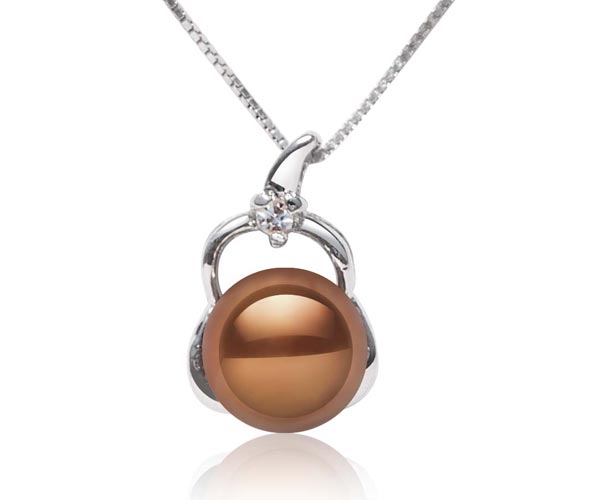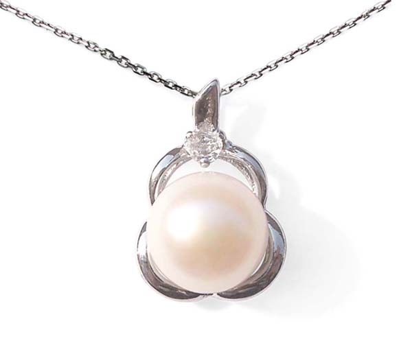 This 9-10mm pearl pendant is crafted in base metal and inlaid with a tiny Cz diamond. It is approximately 5/8″ x 3/8″. The pearl is good quality in large size with high luster, avery round shape in the front and relatively flat at the back side, otherwise known as a button pearl.