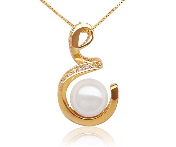 Imagine how beautiful this fine replica pearl pendant will look on you! This pendant is great for the lady who likes something unique. A 10mm southsea shell pearl is set in a spiral setting and is overlayed with 18K yellow gold to keep it tarnish free.