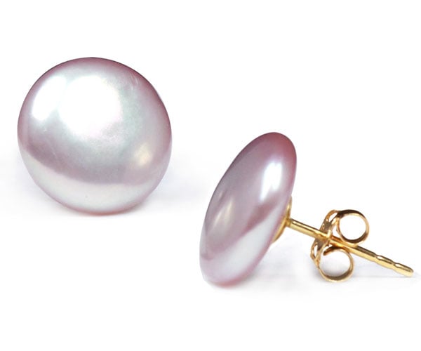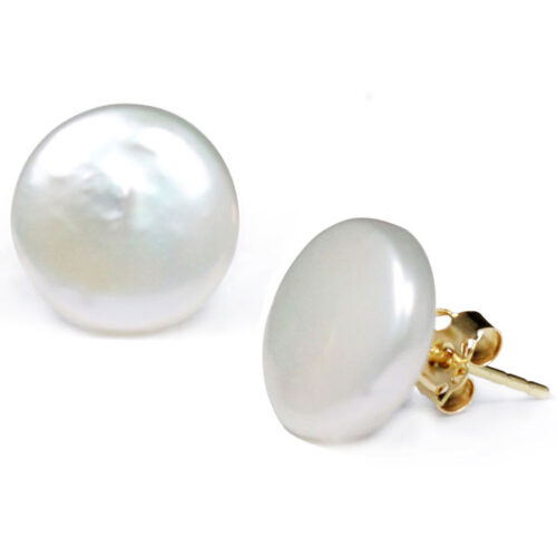 What a classical look!  These large 11-12mm genuine freshwater large coin pearl earrings are set in 14K gold studs. These pearls are high AAA grade with high luster and hardly any surface flaws.