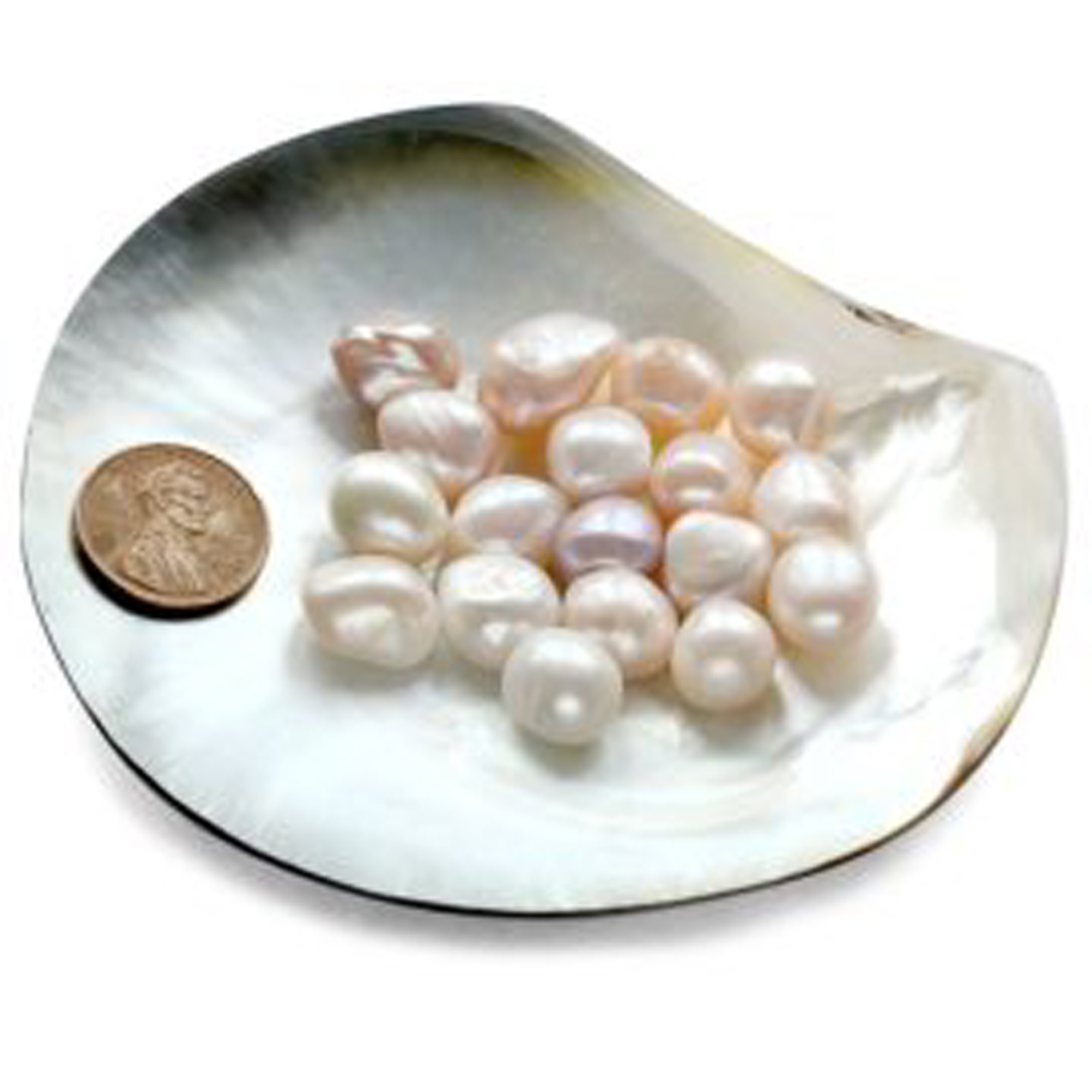 These loose 11-12mm baroque pearls are untreated and sold by ounces. There are approximately 14 pearls per ounce.
