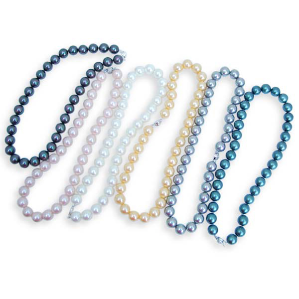 Shell pearls, which are marketed under many brand names, . They are a pearling industry term for simulated, or replica pearls made from mother of pearl.  In the case of our South Sea Shell pearls, they’re shell pearls specifically made to simulate South Seas cultured pearls.  Shell pearls are made in a factory rather than grown inside an oyster or mussel. They’re considered to be the best quality replicas you can get because they are made from shell, not plastic or glass.