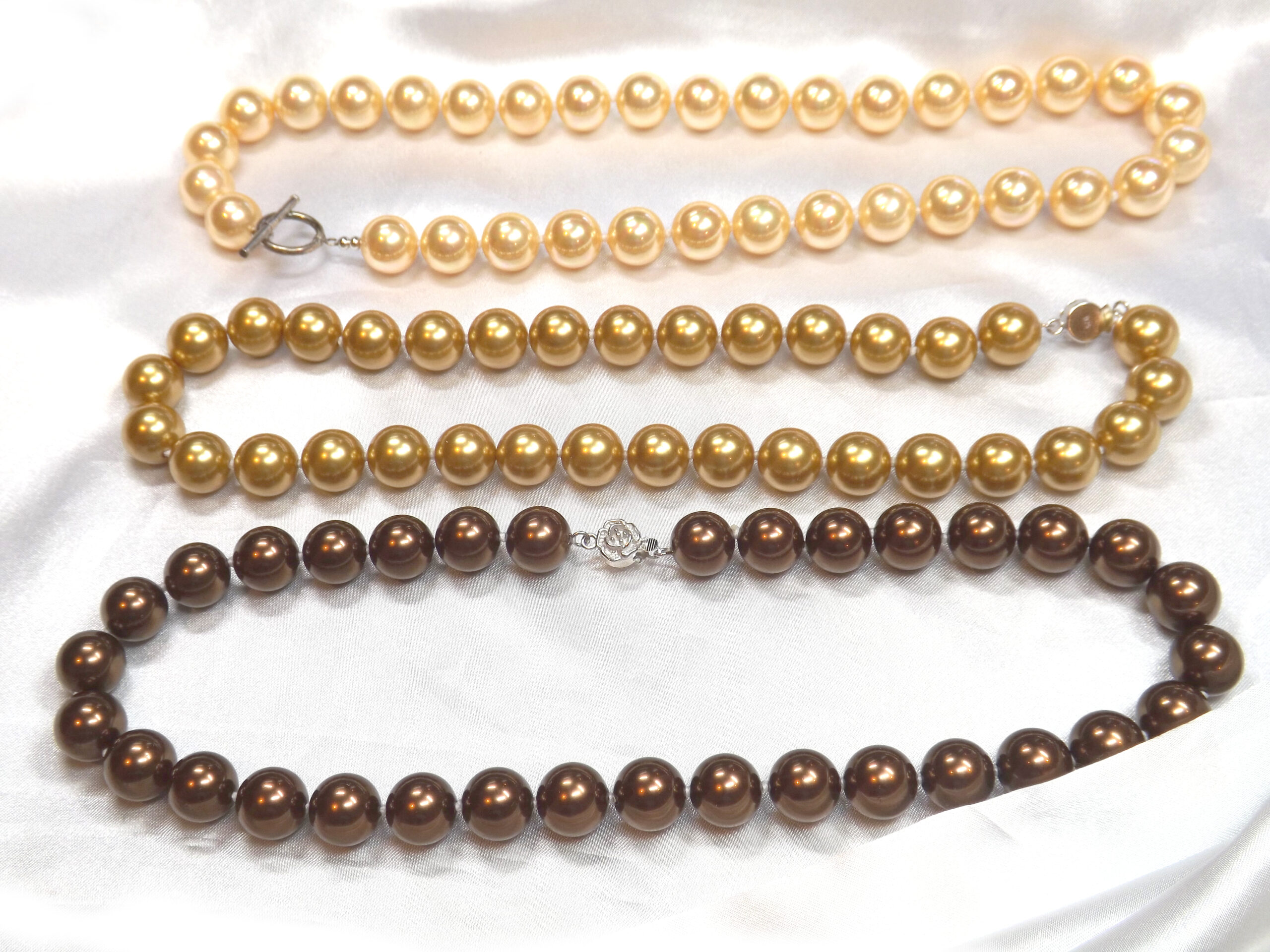 Gold, Chocolate, Champagne, Rose Pink and Grey Colored pearls available while other colors have been sold out, with the option of a rose shaped clasp, a lobster clasp or a toggle clasp.