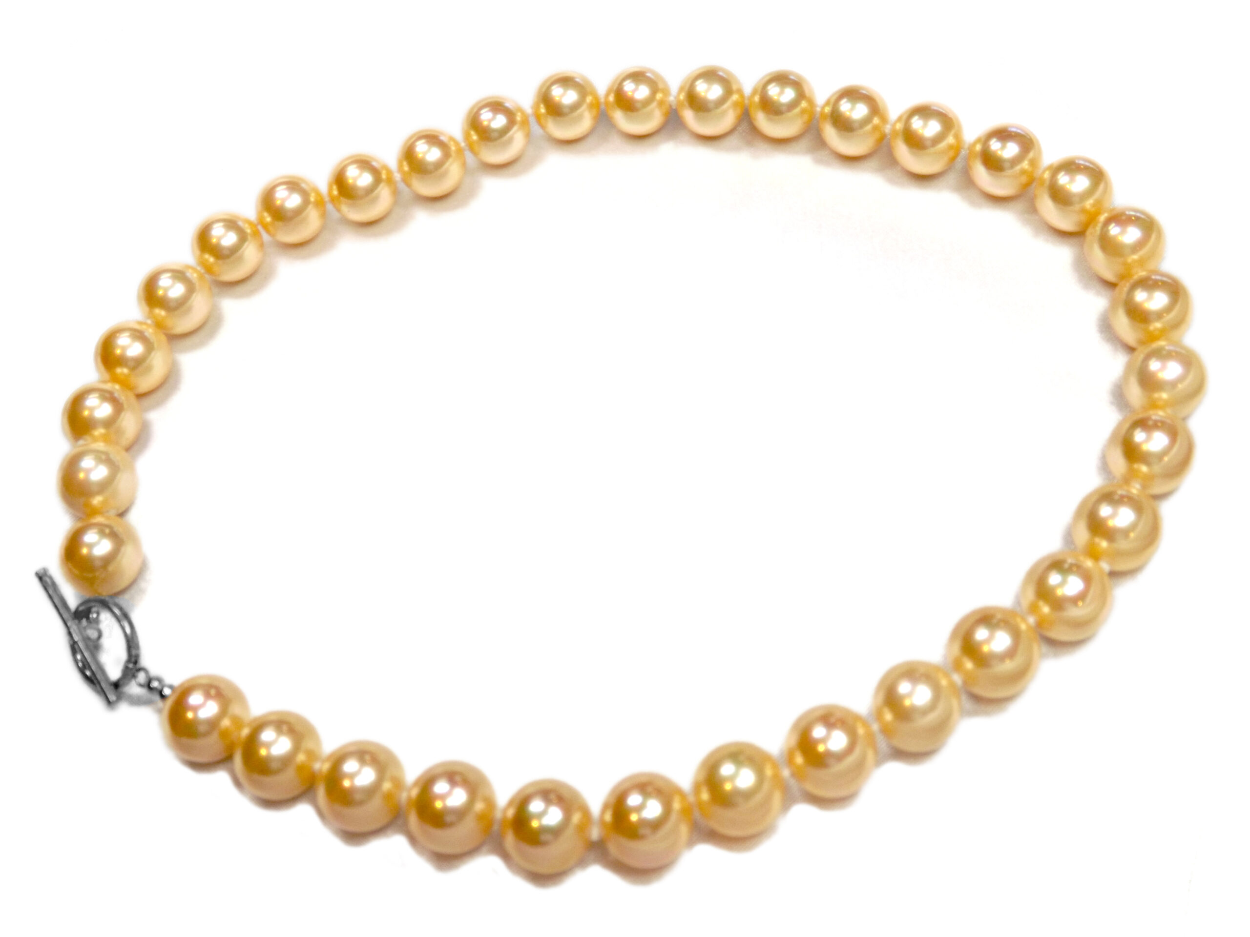 The southsea shell pearl necklace has a length of about 17 inches. We hand knot all pearls individually with double silk thread. We finish it either by a rose shaped sterling silver clasp, a toggle clasp or a lobster clasp. All made of 925 pure sterling silver with 7 layers of 18k white gold to preventing the pure silver from tarnishing.