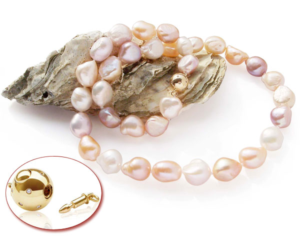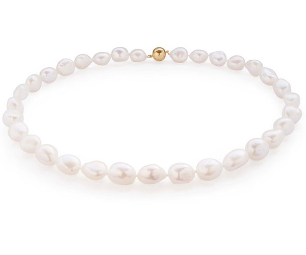 Baroque pearls, unlike their round counterparts, are known for their unique shapes and nonconforming style. This bold necklace is approximately twenty inches long and is finished with a solid 14K yellow gold ball clasp with real diamonds (0.074ct). Currently, white necklaces are available for immediate delivery, but other colors may be available on special request.