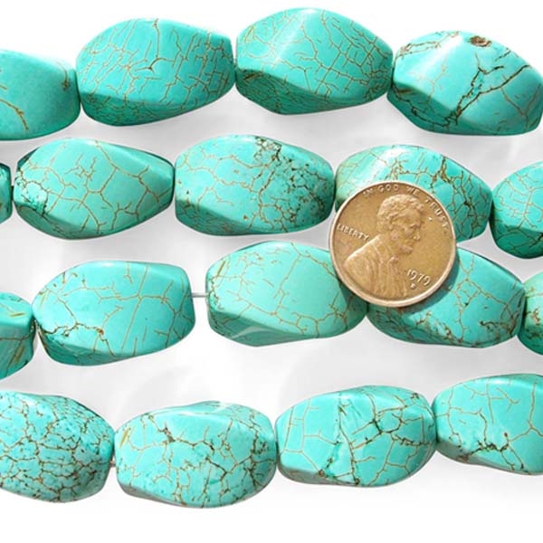 There are approximately 16 pieces of screw shaped turquoise beads per strand measuring approximately 16 inches. Each strand has an approximate weight of 155 grams.