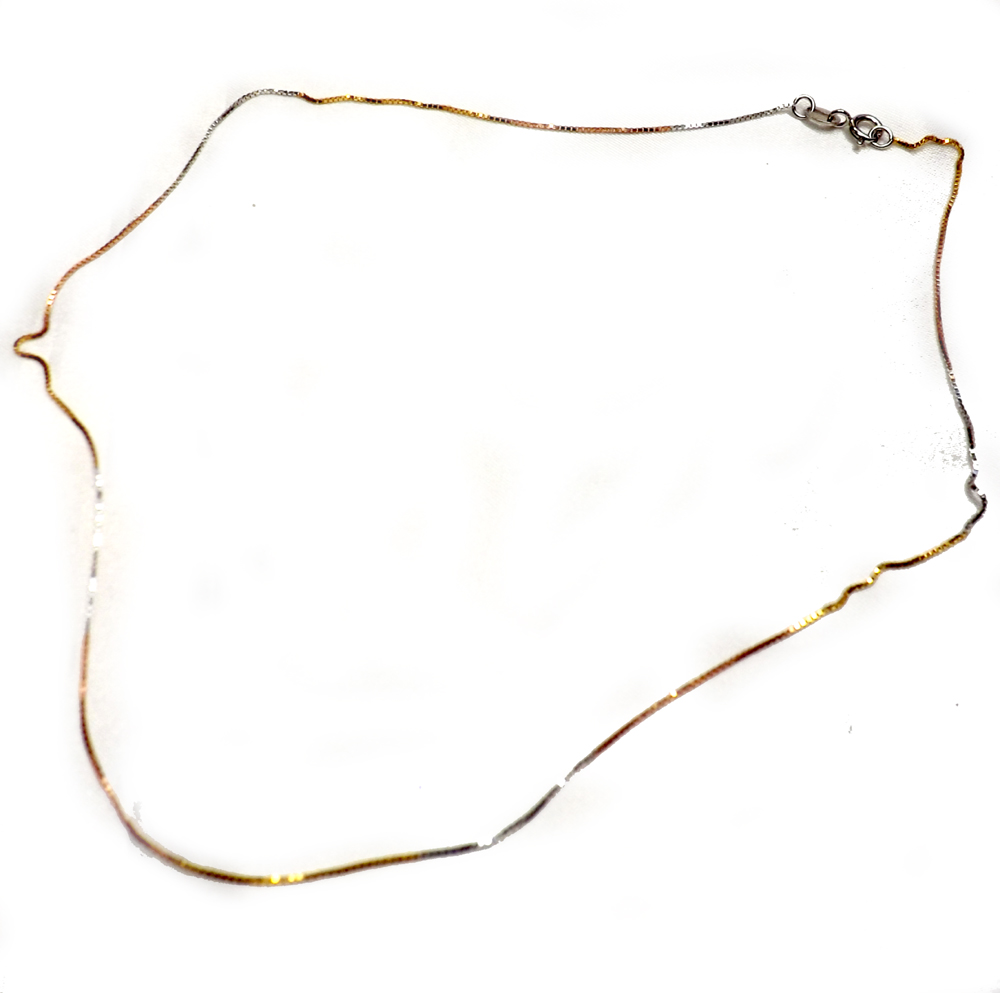 This sterling silver box chain is strong comparing with others. It is made of pure sterling silver with 18K gold overlay to protect 925 sterling silver from tarnishing. It is also suitable for most of sensitive skin as well. Three choices are available: 1) 18K Yellow Gold Over 925 Sterling Silver, 2) 18K White Gold Over 925 Sterling Silver; 3) 18K Yellow, White and Rose 3 Colored Gold alternated Over 925 Sterling Silver. Please use the drop down menu to choose your favorite.