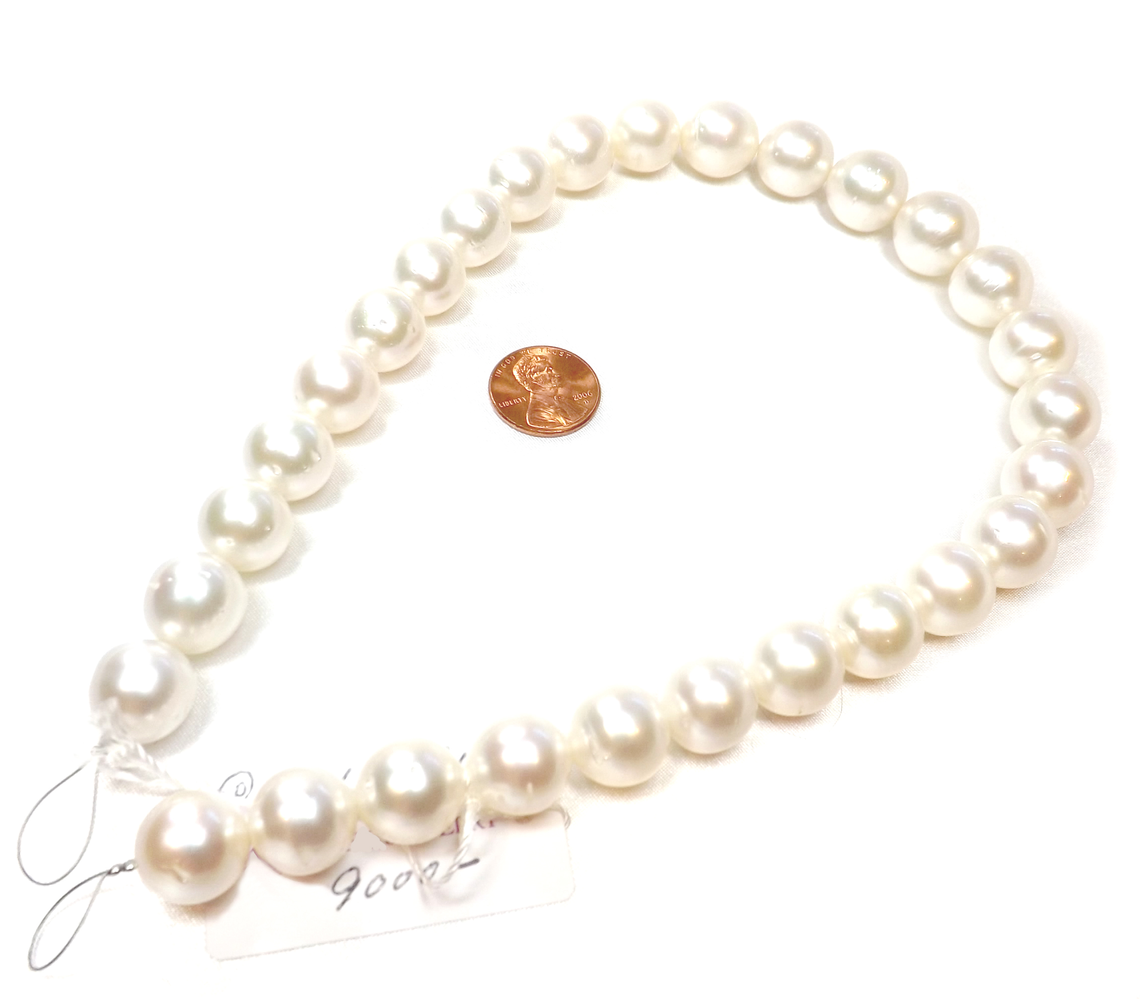 Amazingly beautiful and impressive. All natural! This pearl necklace is a gorgeous and exquisite strand. We use white South Sea pearls, all in truly round shape with a high luster to make it. Even when they do come with some markings and spots on them. That is why they are graded AA+ quality, these pearls are truly beautiful and natural as they are proudly and pleasantly showing that they are made of nature instead of imitations. As you can see from the pictures that were taken from the actual pearl strand, with a penny to give you a sense of their huge sizes
