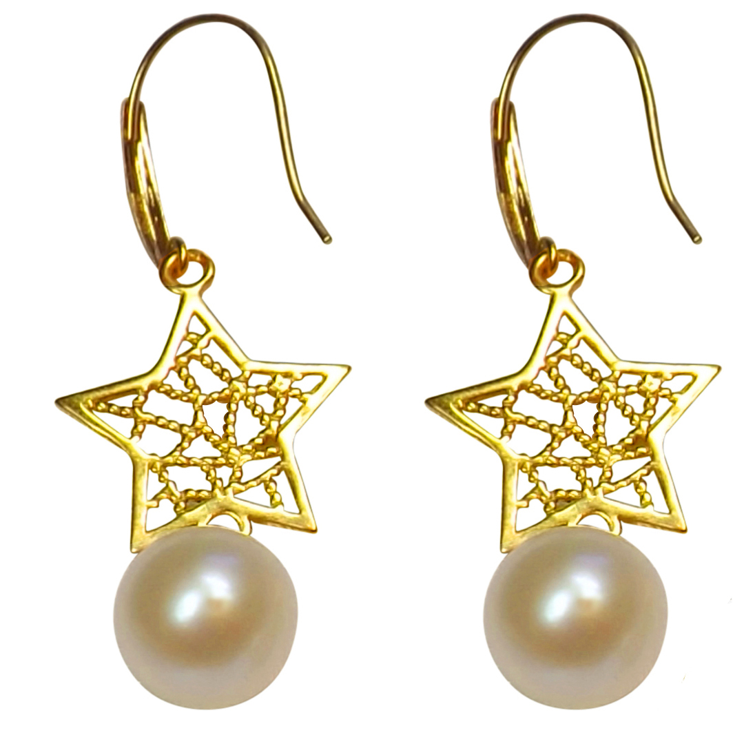 These Stylish 18K Yellow Gold Dangling Star with 7-7.5mm AAA Round Pearl Earrings are unique and will finish any look with just the right amount of sparkle. They have a star filled with an abstract mosaic design.