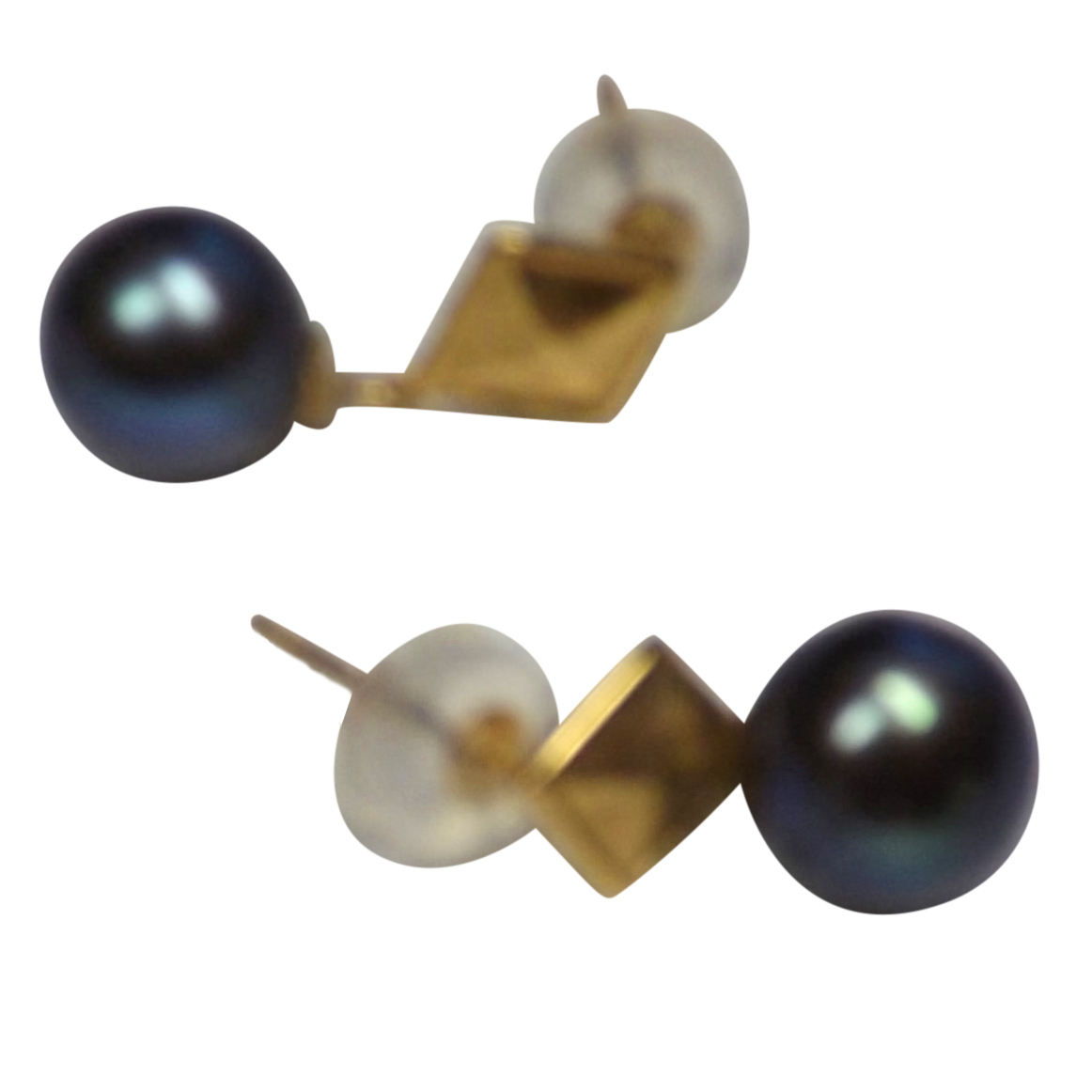 The diamond shape stud is modern and the dangling pearl adds an elegant touch. The backing has an 18K yellow gold core. It is surrounded by silicone for extra comfortable wear.