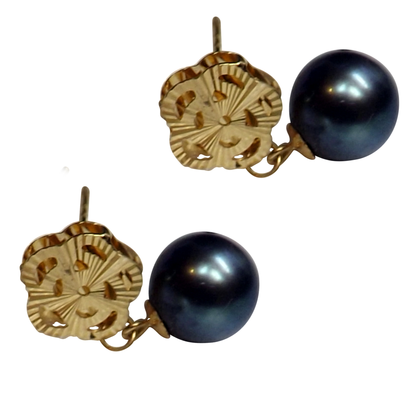 Very cute! These 18K Yellow Gold Flower with Dangle Pearl Earrings are great for any outfit or hairstyle. They have a diamond cut flower with a dangling 7-7.5mm round pearl.
