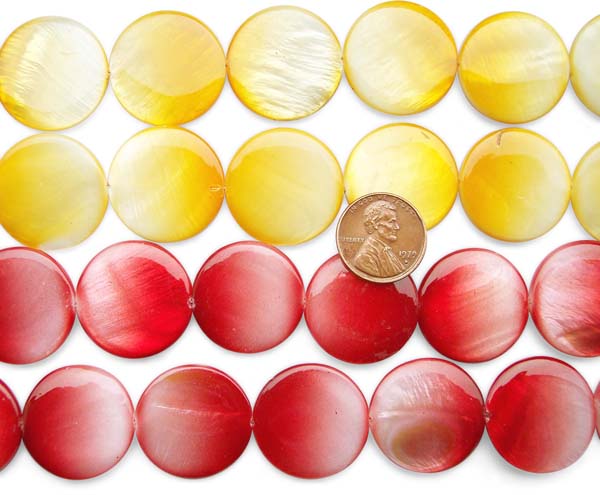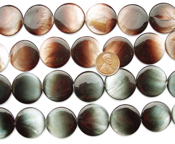 These are 25mm flat mother of pearls in round shape at approximately 15.5inch long. Each strand has an approximate weight of 70grams.