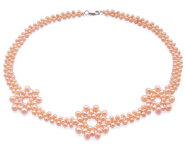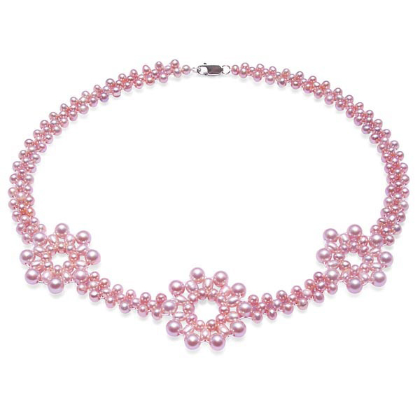 We use 3.5-4mm semi-round pearls and 4-5mm rice shaped pearls to make it. It has 5-6mm AA+(clean surface of 85% or better) round pearls on the side of each flower. All pearls are high quality with best luster. This necklace will not only give you a stunning look, but also make you unforgettable.
