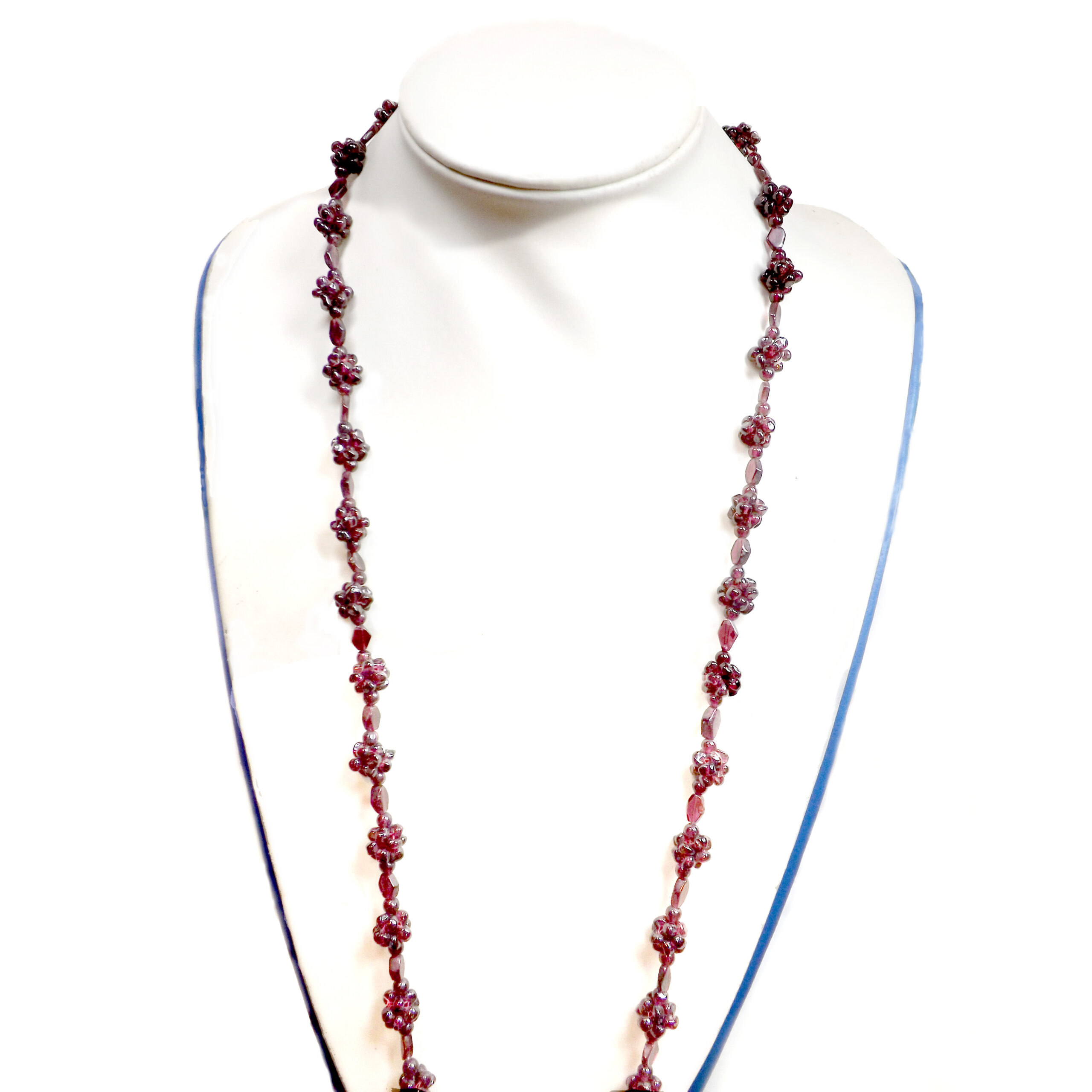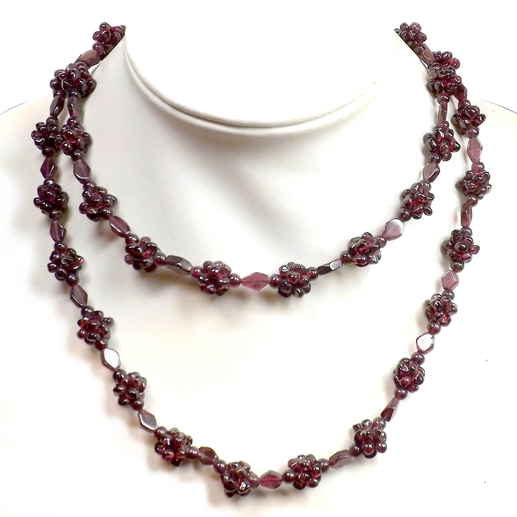 The length of the necklace, measuring 34 inches, allows for a graceful drape. It will be perfect to wear outside of a white or black blouse, a sweater or use it as a double row necklace or two-strand choker, which makes it versatile. Whether you are wearing a simple blouse or a sophisticated evening gown, this necklace will add a touch of glamour and sophistication to your look. The combination of garnet beads and floral blooms combines the elegance of garnet beads with the whimsical charm of delicate flower blooms. This makes the necklace a double versatile piece. You can wear for any occasion, from a casual brunch over a sweater to a formal event.