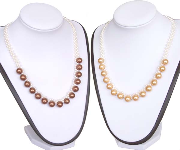 The seashell pearl necklace is made with white colored 3-4mm high luster Round shaped pearls with 15 pieces of large 10mm Southsea Shell pearls. Please note south sea shell pearls have the similar look as the southsea pearls. However they are not south sea pearls which would have cost hundreds of thousands at this grade. Please read more about southsea shell pearls before you make the purchase.