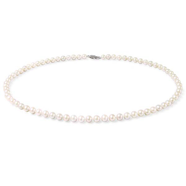 Delicate and refined single pearl strand. A single necklace made of 5-5.5mm AA+ quality round pearls is set in 925 silver, at 18″ long.