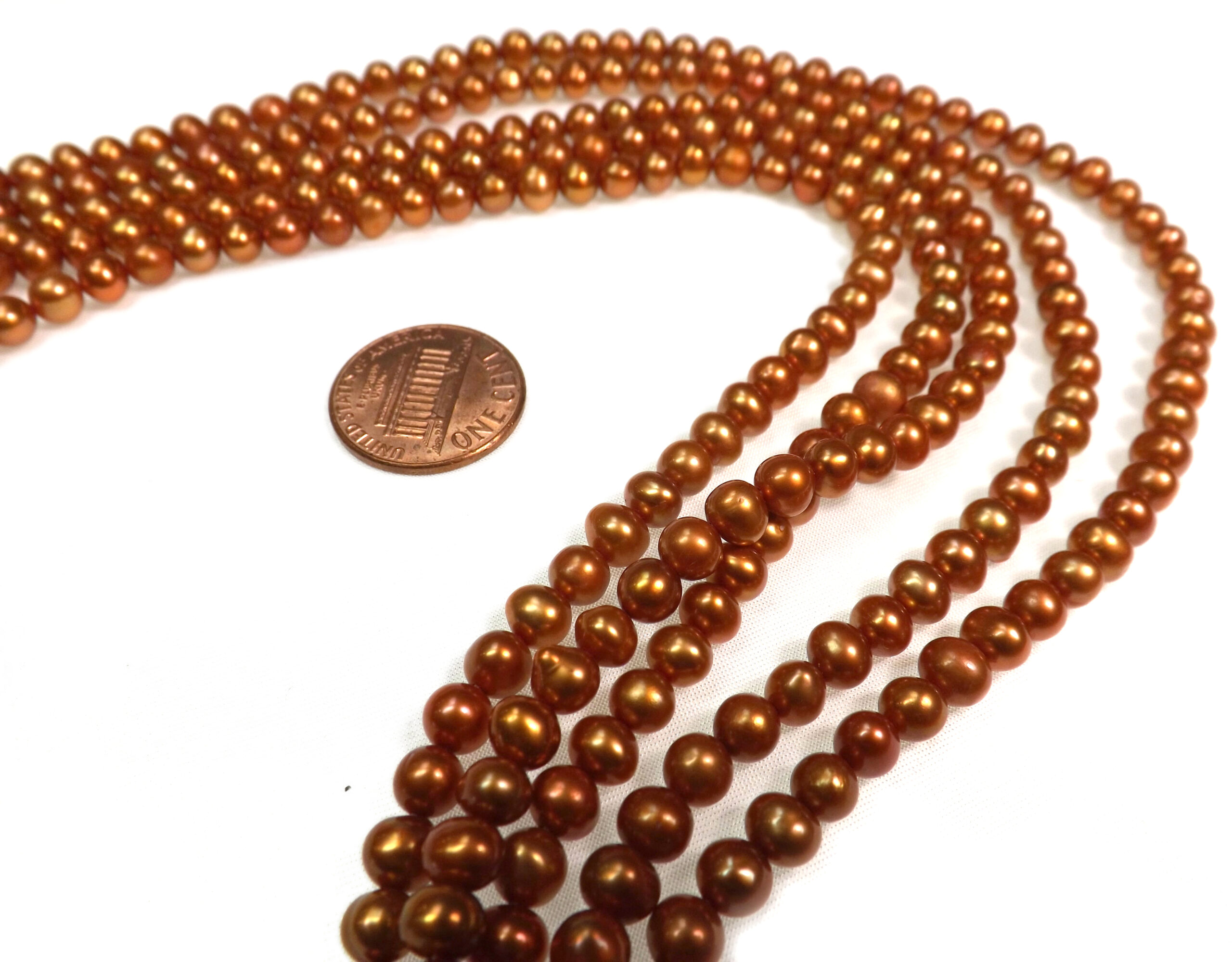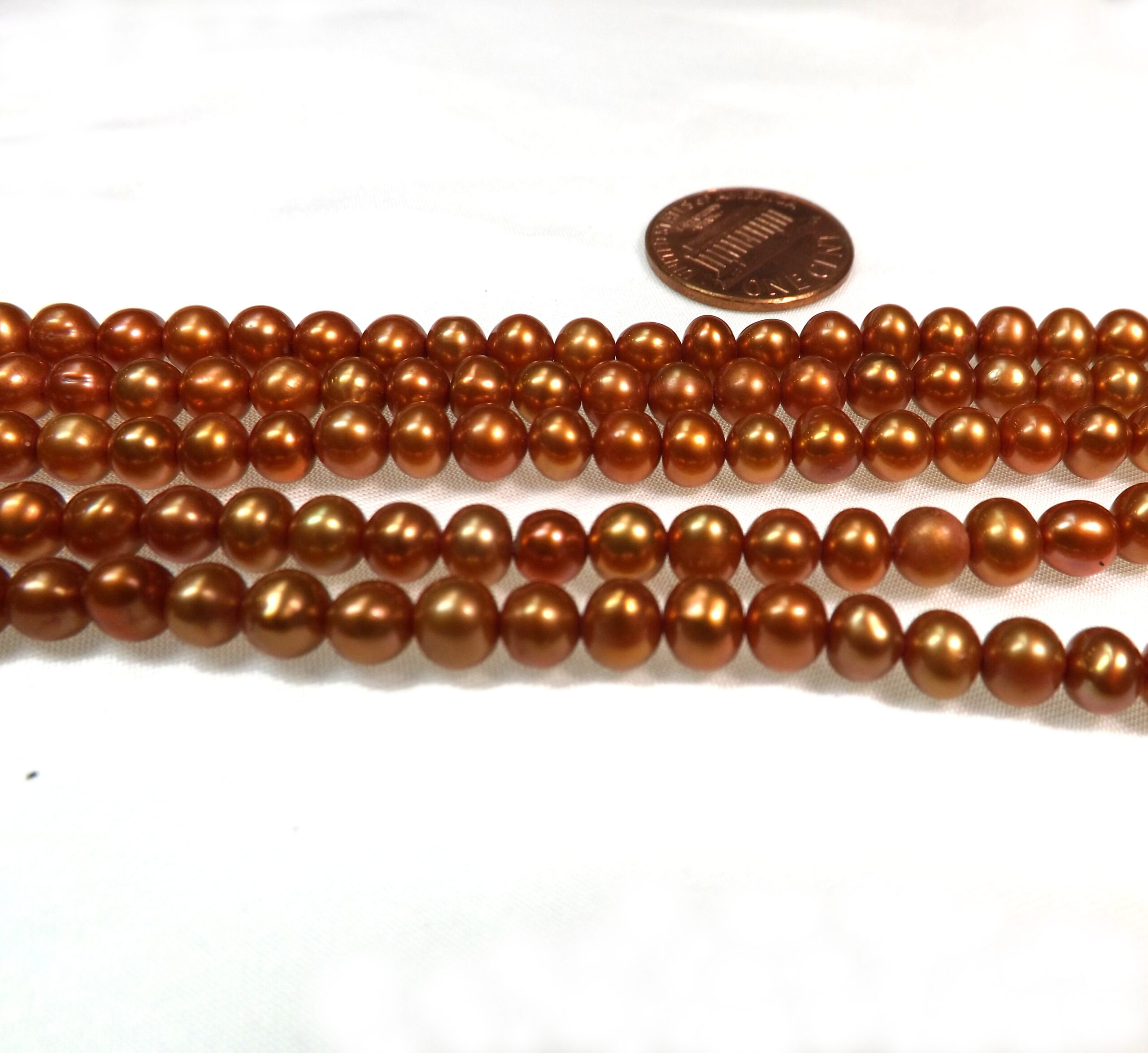 These are orange colored 5-6mm AAA- high quality pearl strands in semi-round potato shapes at approximately 15.5in long.