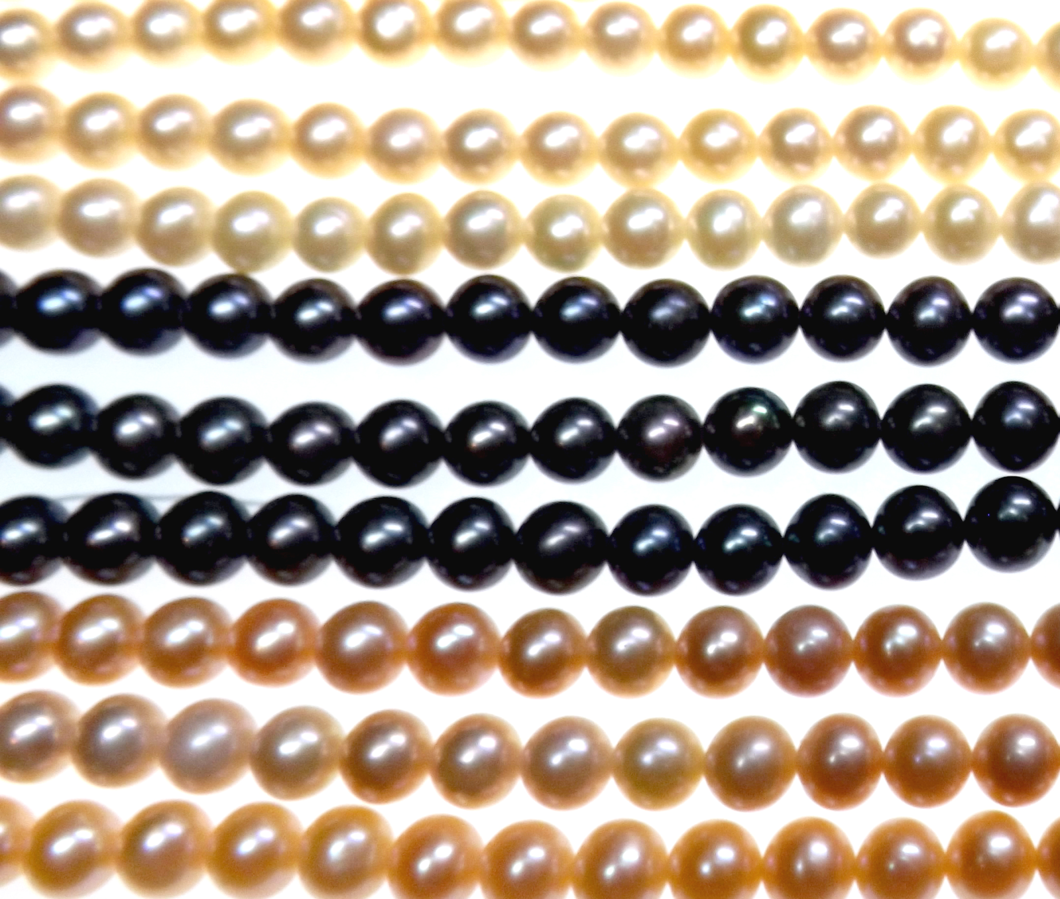 These 5-6mm round pearl strands are high AAA- quality. The pearls have very high luster in near round shapes, and with hardly any surface markings or flaws.