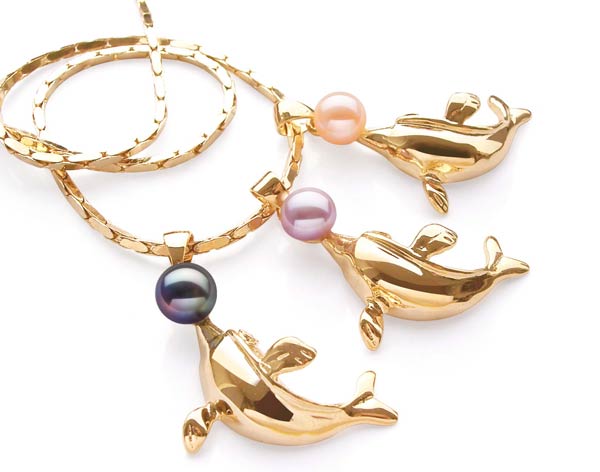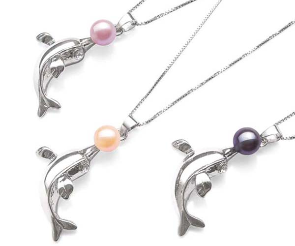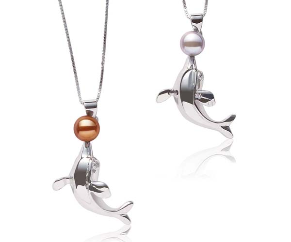 This fun and stylish dolphin shaped pearl pendant features a genuine 6-7mm button pearl on the dolphin’s nose!