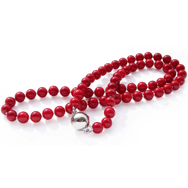 This 6-7mm coral necklace is carefully hand knotted by our skilled workers using double-stranded silk thread. There are two options for the easy-to-wear magnetic metal clasp: one is base metal but filled with 7 layers of 18K white gold over, the other is for a 925 pure sterling silver magnetic clasp.