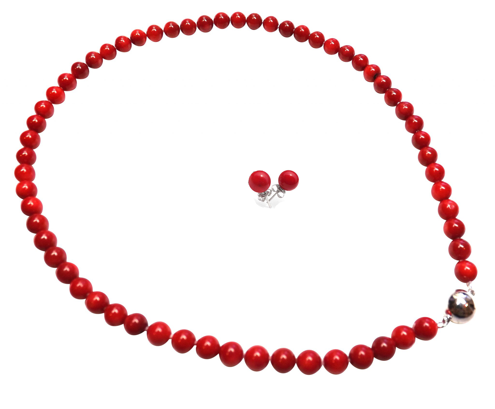 This is for a matching set of 2, with a beautiful and easy-to-wear single-row coral necklace and a a pair of earrings. We use both items with 6-7mm gorgeous red colored round coral beads. The necklace has a generous length of 18inch long. And the earrings are 925 sterling silver in studs style.