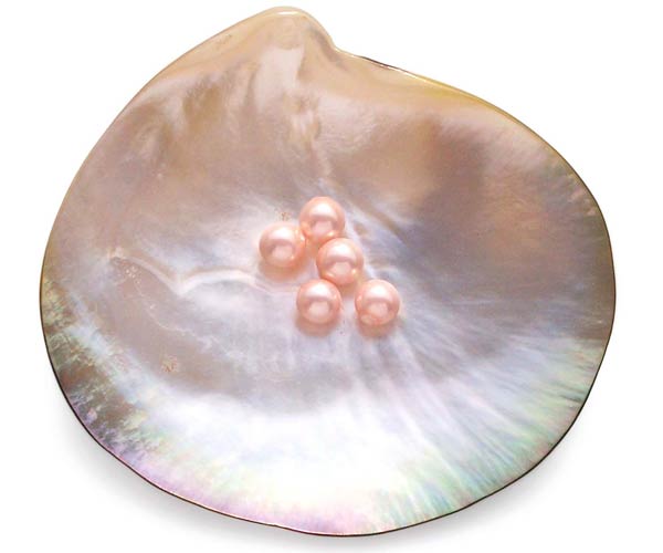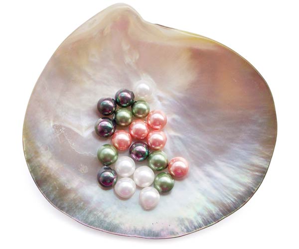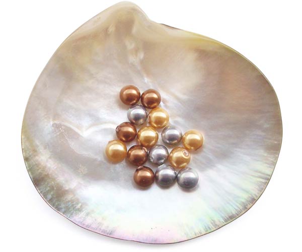 Shell pearls, which are marketed under many brand names, are a pearling industry term for simulated, or replica pearls made from mother of pearl.  In the case of our South Sea Shell pearls, they’re shell pearls specifically made to simulate South Seas cultured pearls.  Shell pearls are made in a factory rather than grown inside an oyster or mussel. They’re considered to be the best quality replicas you can get because they are made from shell, not plastic or glass.