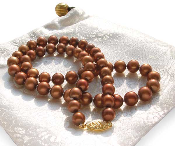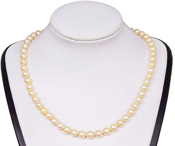 Several colored pearls are available. For the color of gold, there are two different over toned pearls, one is gold, the other is yellow (lighter colored gold on the top) as the picture shows. There are also white, pink, mauve(a very pretty white color with a very light purple color as the first picture shown. Both of gold colored round pearl necklaces are AA graded pearls while all other colored round pearl necklaces are all higher AA+ higher graded pearls.