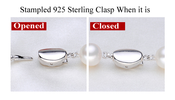 The pearls are all real with high luster and hardly any surface flaw only by close examination. The pair of sterling silver studs earrings is made of 8-8.5mm white pearls for its simple elegance with stamped 925. The necklace is also finished by 925 pure sterling silver with 18k white gold over to protect it from tarnishing and also for easily put on or be taken off.