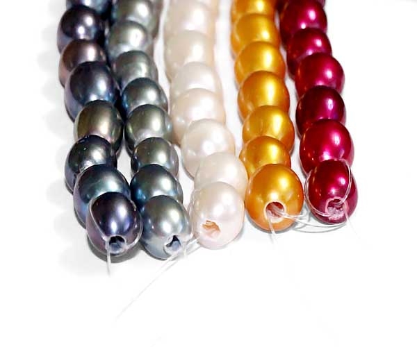 These 7-8mm (width) Rice pearl strands are AA+ grade with high luster and hardly any flaws or surface markings. We have them drilled with 0.9mm, 1.7mm, or 2.3mm holes.