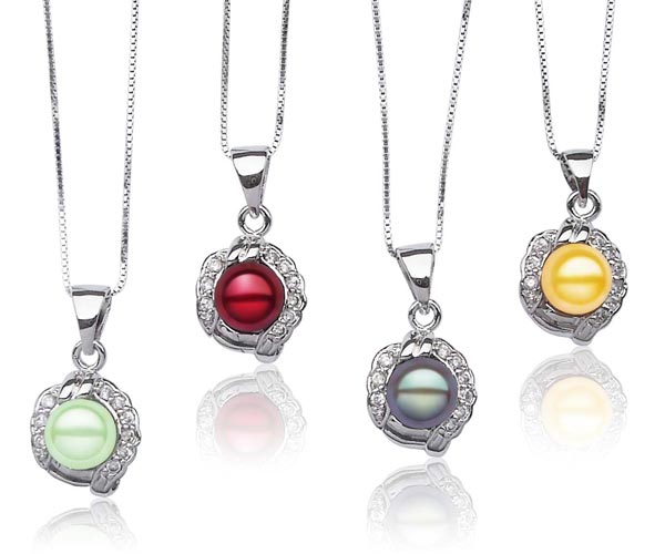 7mm White, Pink, Mauve and Black Pearl Pendant with Tiny Cz Diamonds, 925 Sterling Silver Chain