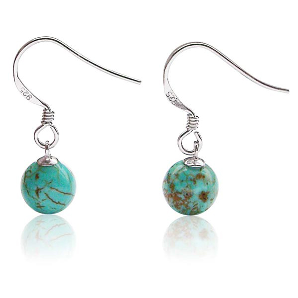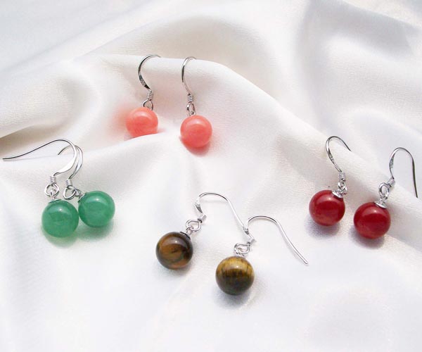 These earrings are made of 8-9mm semi-precious stones in perfectly round shape. They are set in sterling silver, with 925 stamped on their french wires and approximately one inch in length.