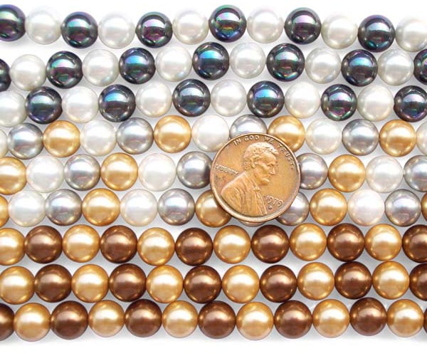 Shell pearls, which are marketed under many brand names. They are a pearling industry term for simulated, or replica pearls made from mother of pearl.  In the case of our South Sea Shell pearls, they’re shell pearls specifically made to simulate South Seas cultured pearls.  Shell pearls are made in a factory rather than grown inside an oyster or mussel. People consider them to be the best quality replicas you can get because they are from shell, not plastic or glass.