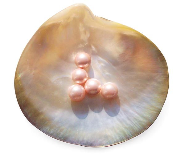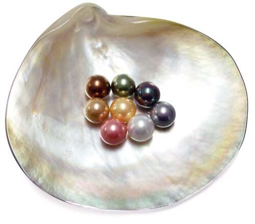 Shell pearls, which are marketed under many brand names, are a pearling industry term for simulated, or replica pearls made from mother of pearl.  In the case of our South Sea Shell pearls, they’re shell pearls specifically made to simulate South Seas cultured pearls.  Shell pearls are made in a factory rather than grown inside an oyster or mussel. They’re considered to be the best quality replicas you can get because they are made from shell, not plastic or glass.