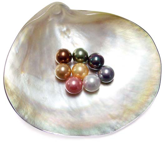 9 colors of 8mm round southsea shell pearls are available for immediate delivery: white, peacock black, gold, champagne, grey, peacock green, Tahitian black, and pale pink.