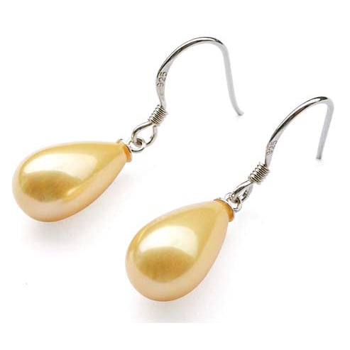 This pair of earrings feature Southsea shell (replica) pearls in a teardrop shape at 8x14mm in size. They are set in a stamped 925 sterling silver French dangling style for pierced ears.