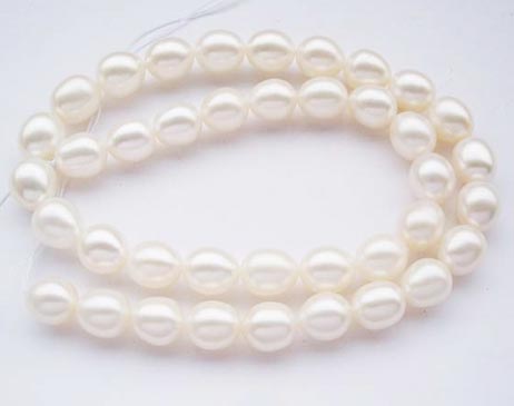 This is 9-10mm high AAA quality rice or oval pearl strand. The pearls have a very high luster and minimal markings or flaws.They can be used for high end jewelry that have a gold clasp.