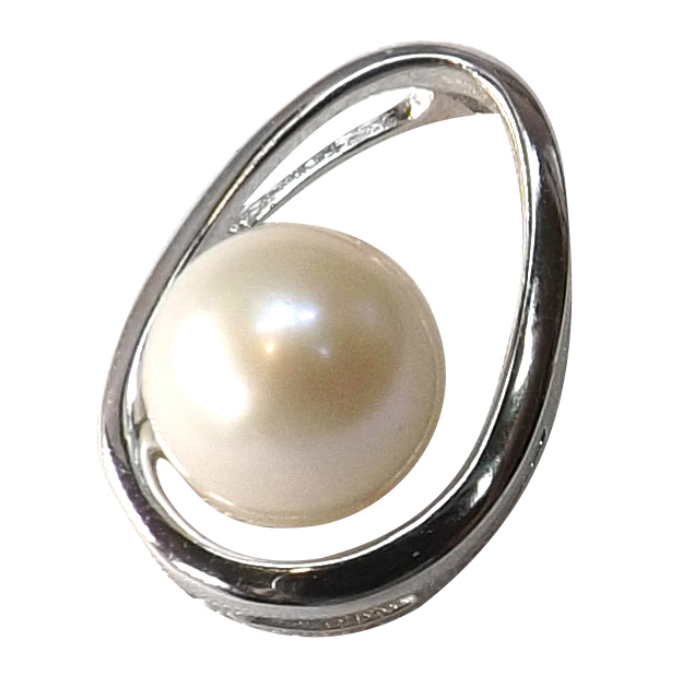 The drop shaped pearl pendant setting is made of pure 925 sterling silver with 18k white gold overlay to prevent tarnishing. It measures 7/16″ by 5/8″ and weighs .75 grams.
