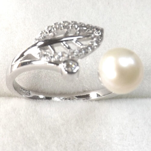 This 925 Sterling Silver Leaf Design and Pearl Ring has lab created diamonds, and an adjustable opening on the top. You can adjust it to any sized finger. The button pearl is 6-7mm.