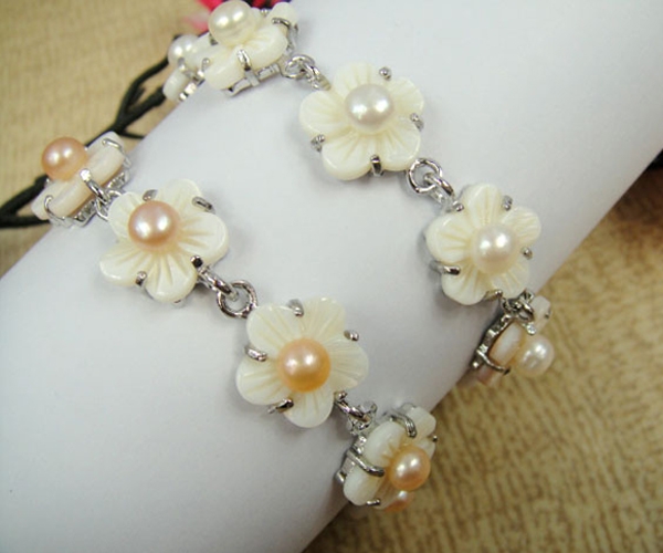 Beautiful Flower Shaped Mother of Pearl and Pearl Bracelet at Flexible Length from 6 Inch to 9 Inch Long