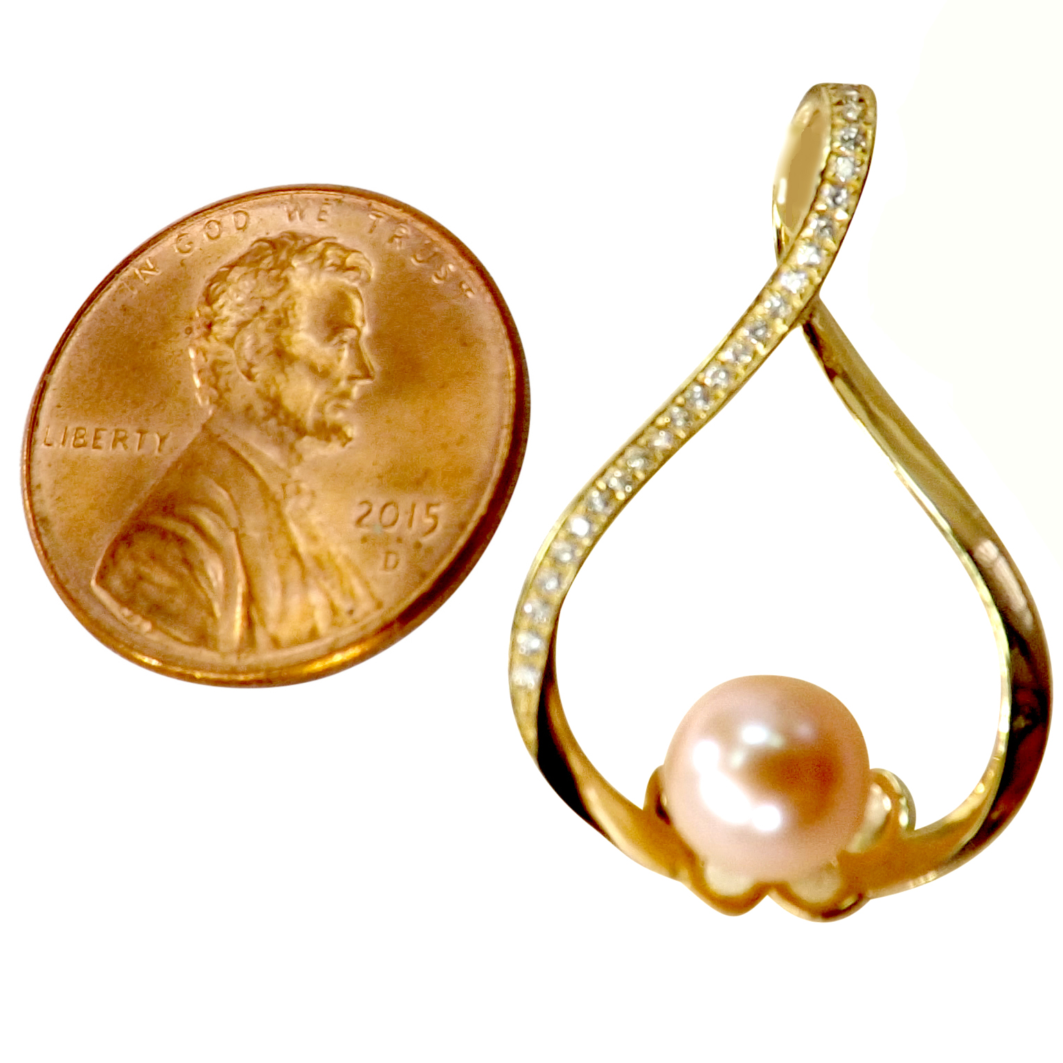 This Large and Modern 14K Yellow Gold Pearl Pendant with CZs is elegant and sophisticated.  It has a unique twisted teardrop design with Lab Created Diamonds going all the way down one side, giving it amazing sparkle.  Plus, the 8-9mm pearl is AAA, so you are sure to get plenty of compliments on this beauty.