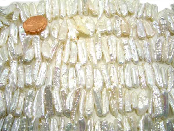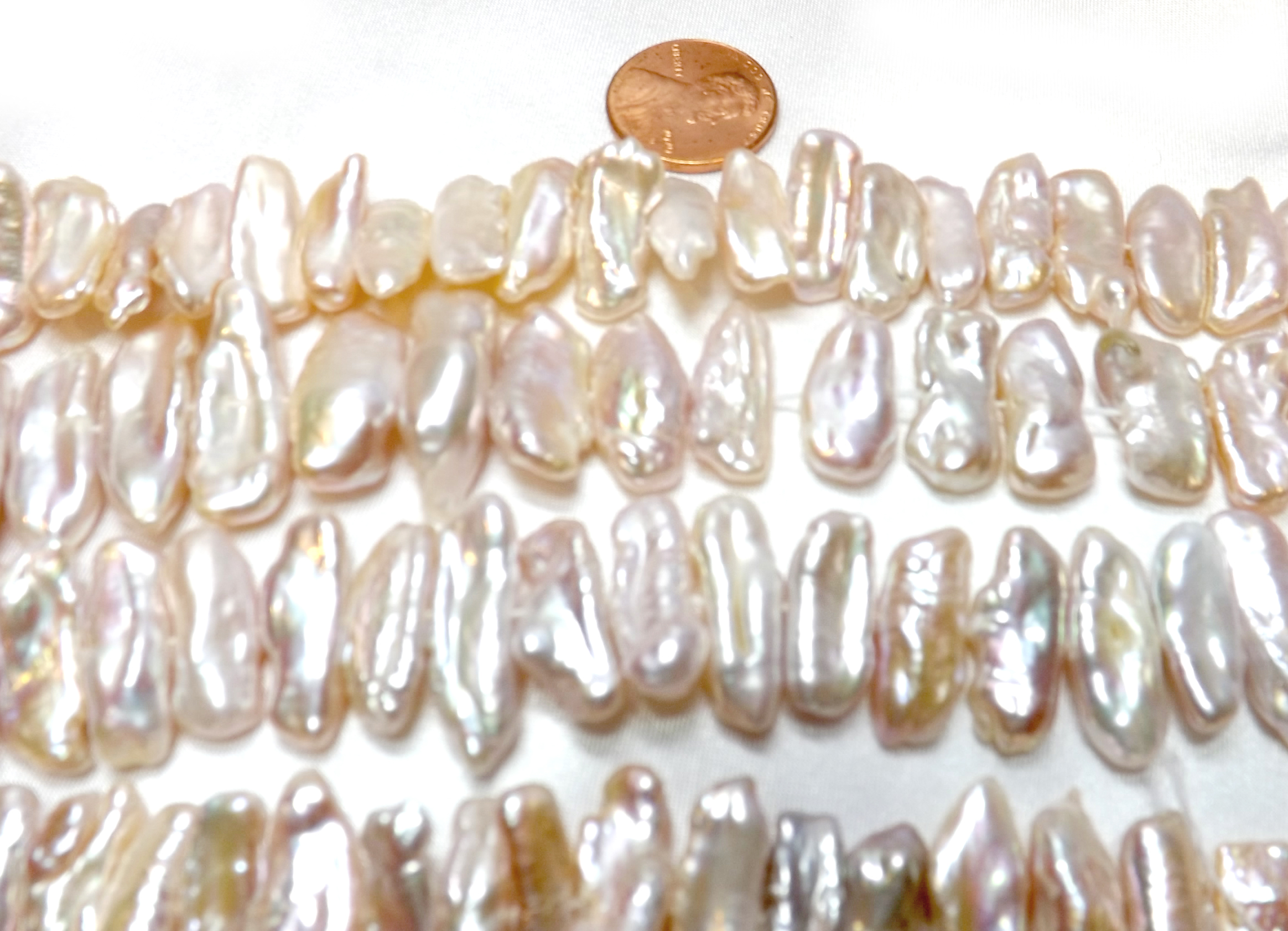 We took pictures from real strands with a penny to give you a sense of size, as the sizes are various. The length of the biwa pearl is approximately 3/5″ to 4/5″ long and the width is about 1/4″ to 2/5″ long. Or about 7x18mm in sizes. Because they are made of nature, they do come a little different from one to another, as you can see from the enlarged strands.