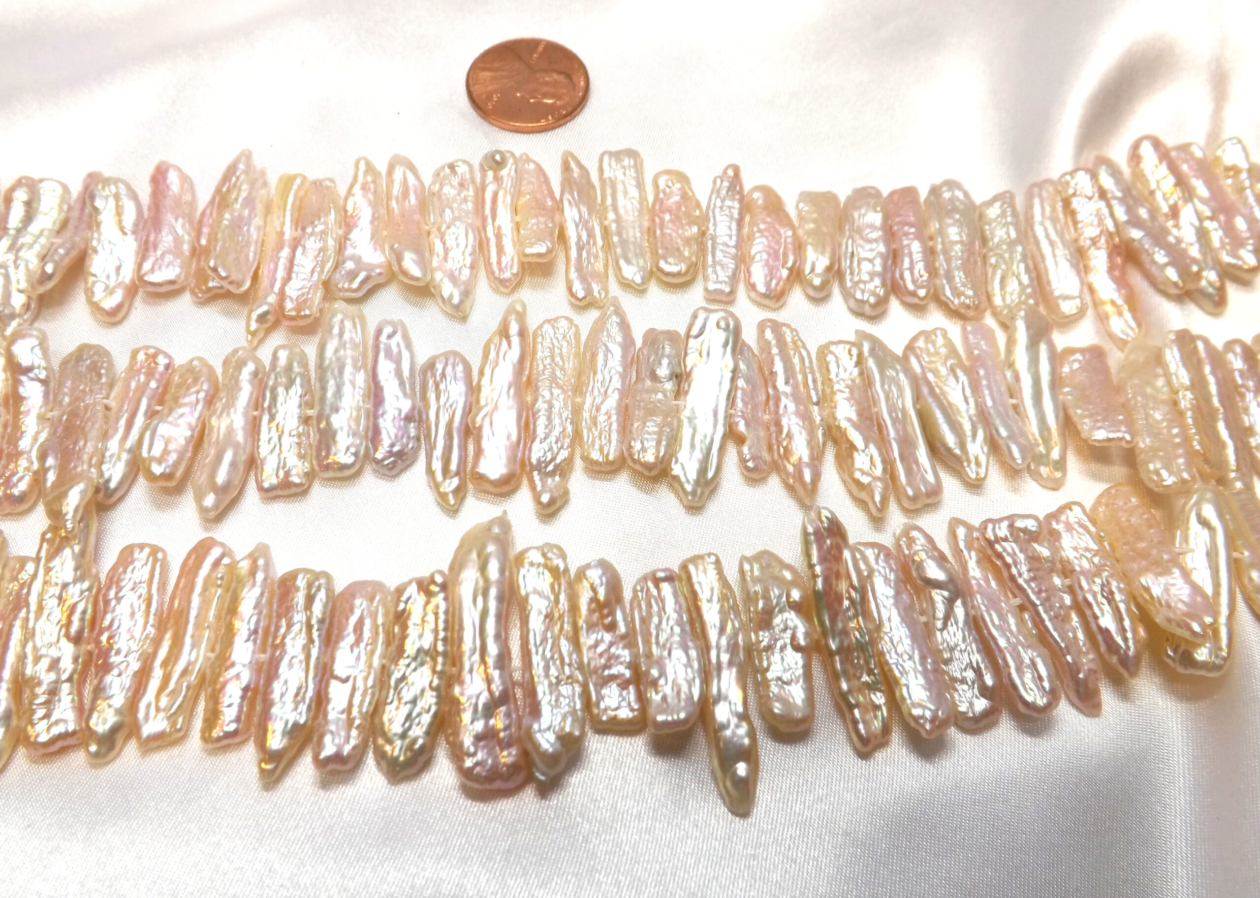 These are beautiful center drilled long stick biwa pearl strands in various colors. They are in white, pink, mauve or black color on this strand at approximately 15.5inch long.