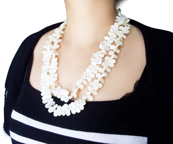 On of our newest styles is this long necklace made of 8x12mm flat drop shaped sea shell beads without a clasp. The necklace measures approximately 48in and weighs around 158 grams.