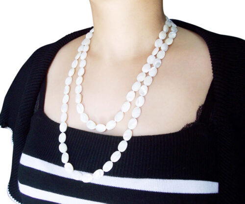 One of our newest styles is this long necklace made of 10x14mm flat oval shaped sea shell beads without a clasp. The necklace measures approximately 48in and weighs around 71 grams.