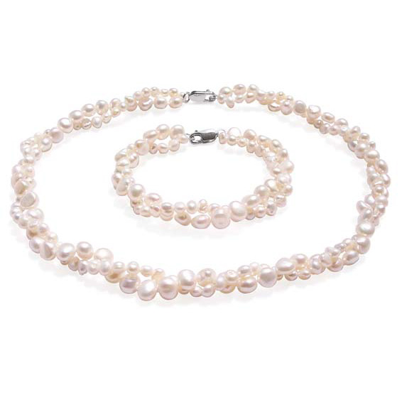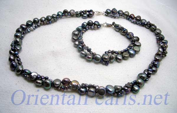 The 2-row baroque pearl sets include two rows of different sized, unusual semi-baroque shaped pearls. All pearls are genuine freshwater pearls. The larger pearls are around 6.5-7.5mm and the smaller ones are 3.5-4.5mm.