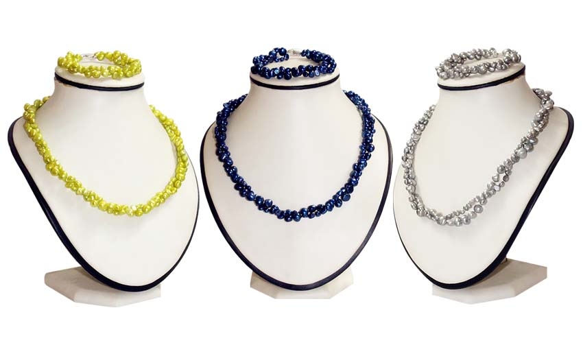 These matching 2-row baroque pearl sets include different colored unique baroque shaped pearl necklace and pearl bracelet. Both of the are in stamped 925 sterling silver.
