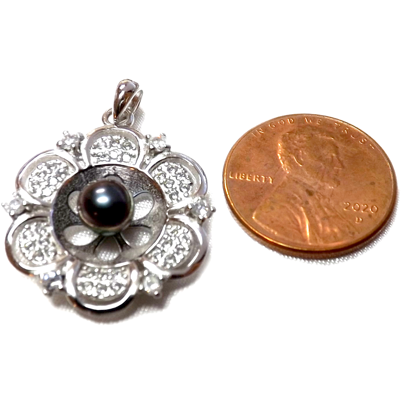 The pearl flower pendant measures 7/8″ by 1 1/8″. It is even bigger than a penny as the pictures are showing, to give you a sense of size, although it might not be the prettiest.
