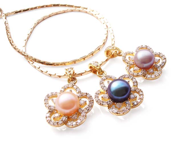 This is a beautiful flower shaped pearl pendant surrounded by sparkling cubic zirconium diamonds. A genuine 8-9mm round shaped button pearl is set in this elegantly shaped setting with an 18K yellow gold overlay to keep it tarnish free.
