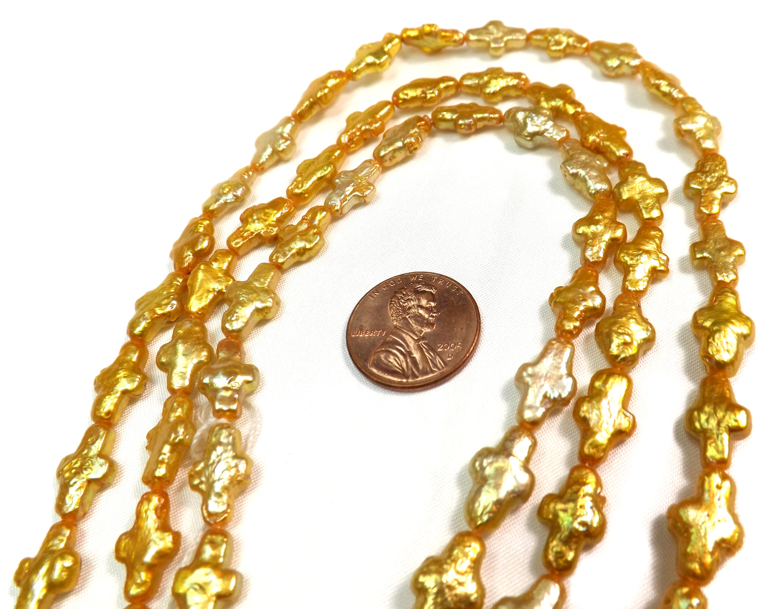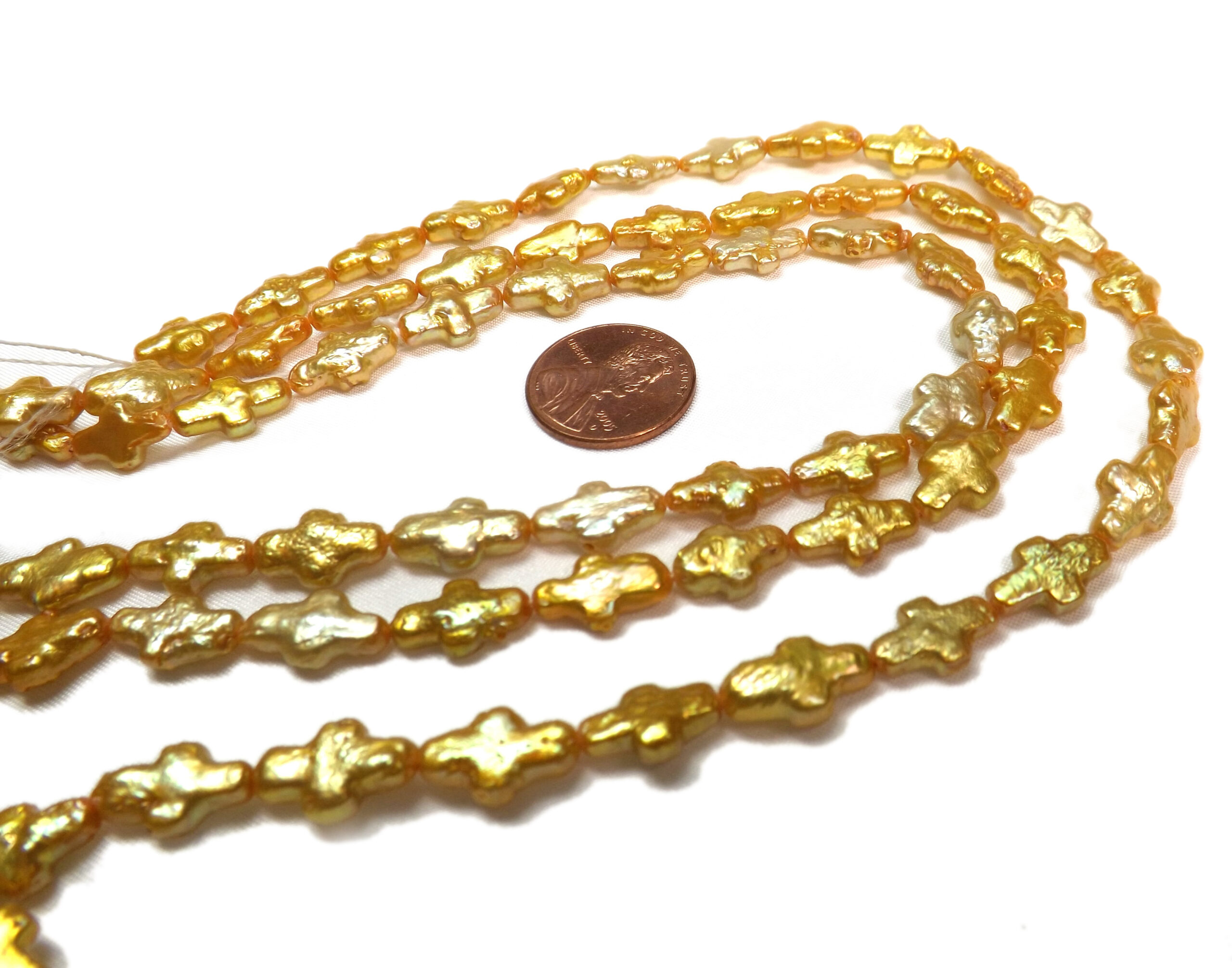 Looking for length drilled gold colored cross shaped loose pearls strands? You found the right place.