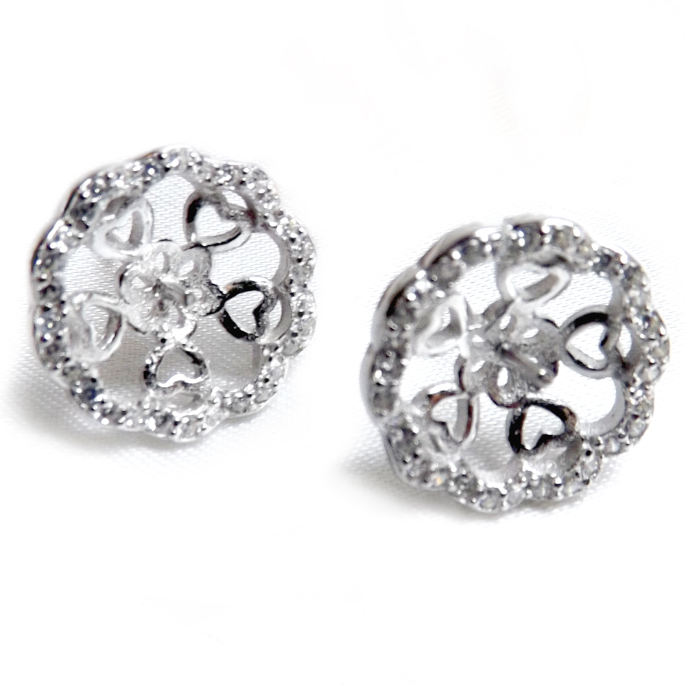 They are made with 925 Sterling Silver with 18K white gold overlay to prevent tarnishing. The scalloped edge is accented with lab created diamonds. And the inner part of the setting is a circle of hearts. The setting accommodates a pearl or stone 4mm and up, depending on how much of the hearts you want to show.