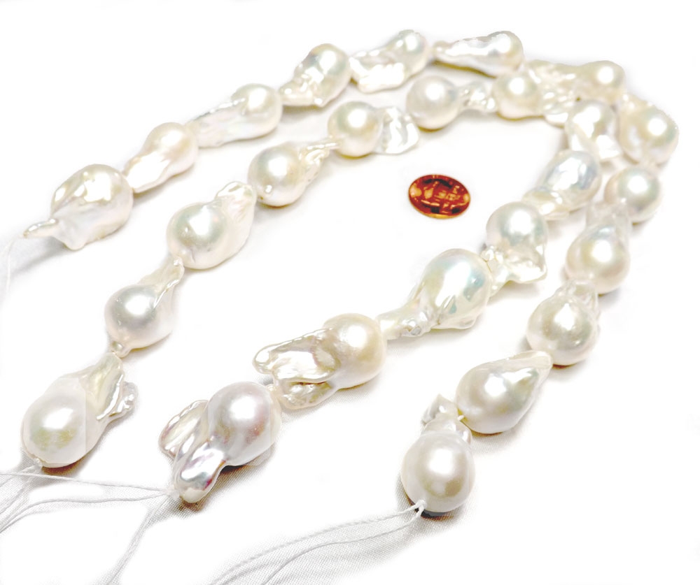 These are beautiful huge baroque pearls with high luster. They range from about 20mm to as huge as 38mm from their longest dimensions, all strung on a temporary strand with pearls fully drilled.